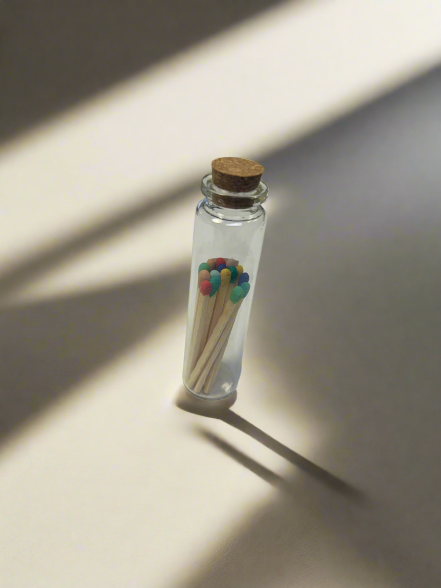 Qty 15 colorful matches either in a glass jar or a plastic bag. Includes striker strip.